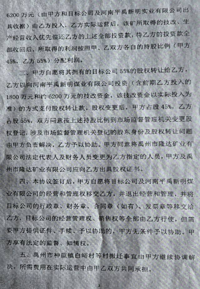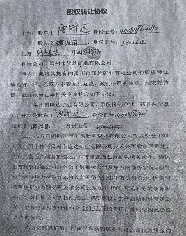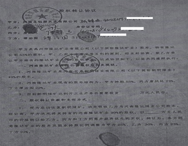 2021年1月25日,唐战廷、谭治国及目标公司隆达矿业公司和乙方张峰杰签订《股权转让协议》,约定乙方自愿向平禹新明煤业公司投入资金1800万元用于偿还隆达矿业及公司股东因筹建、生产经营所欠债务的偿还;乙方进驻煤矿后,平禹新明煤业技改资金约6200万元由乙方投入;甲方自愿将其拥有的目标公司55%股份转让给乙方,乙方以向平禹新明煤业投资的1800万元和6200万元的技改资金的方式支付股权转让款;本协议签订后,甲方自愿将目标公司及平禹新明煤业公司的经营和管理权移交乙方。之后隆达矿业股权变更为河南圣钰源贸易公司占55%,唐战廷占23%,谭治国占22%,法人为张峰杰。也就是说此次股权转让就是圣钰源公司拿出8000万元投资平禹新明煤业公司,谭治国拿出了自己所持有的55%股权转给圣钰源公司。