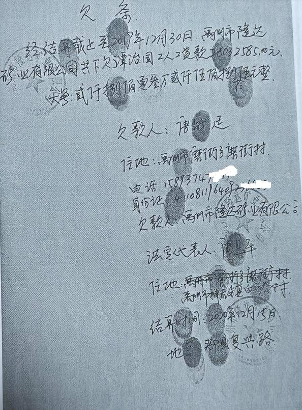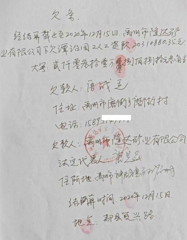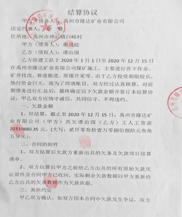 2020年12月15日,隆达矿业公司和实际控制人唐战廷签订结算协议并出具欠条,法人唐魁签字盖章确认2020年1月1日至12月25日,隆达矿业公司欠谭治国工人工资款达2031万零883.5元。 张锋杰作为法人后,实控人张团结负责煤矿经营,2021年至2023年8月11日,生产原煤约33万吨,而其经手的煤炭销售款竟达2.5亿元左右,这些巨额销售款进入了张团结指定的账户。 2023年8月12日,同样因资金链断裂、无法支付包工队工资,矿上再次被迫停产。因矿上未向张伟峰工队支付工资,导致其无力正常经营,无奈之下,张伟峰退出,由谭治国个人再次组织包工队承包生产。经结算,截至2023年8月11日,矿上又拖欠谭治国包工队658多万元。对于这笔债务,矿上予以认可但却以新增股东杨广西拿着公章为由,至今未给其出具欠条。