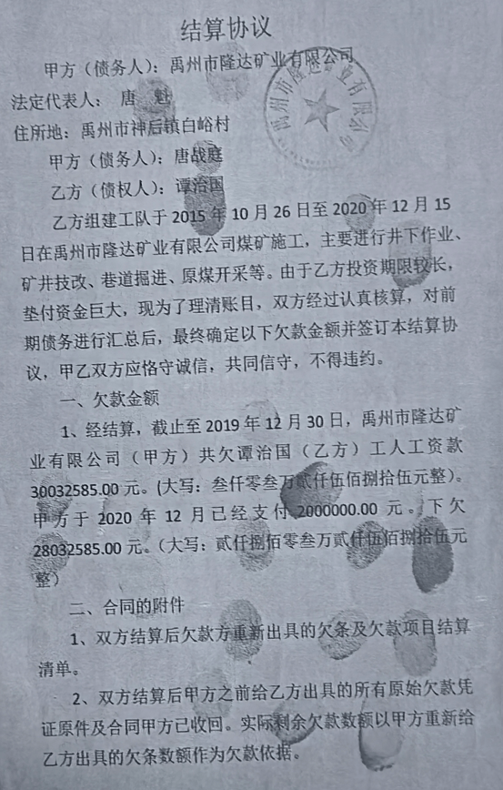 2020年12月15日,隆达矿业公司和实际控制人唐战廷签订结算协议并出具欠条,法人唐魁签字盖章确认2020年1月1日至12月25日,隆达矿业公司欠谭治国工人工资款达2031万零883.5元。 张锋杰作为法人后,实控人张团结负责煤矿经营,2021年至2023年8月11日,生产原煤约33万吨,而其经手的煤炭销售款竟达2.5亿元左右,这些巨额销售款进入了张团结指定的账户。 2023年8月12日,同样因资金链断裂、无法支付包工队工资,矿上再次被迫停产。因矿上未向张伟峰工队支付工资,导致其无力正常经营,无奈之下,张伟峰退出,由谭治国个人再次组织包工队承包生产。经结算,截至2023年8月11日,矿上又拖欠谭治国包工队658多万元。对于这笔债务,矿上予以认可但却以新增股东杨广西拿着公章为由,至今未给其出具欠条。